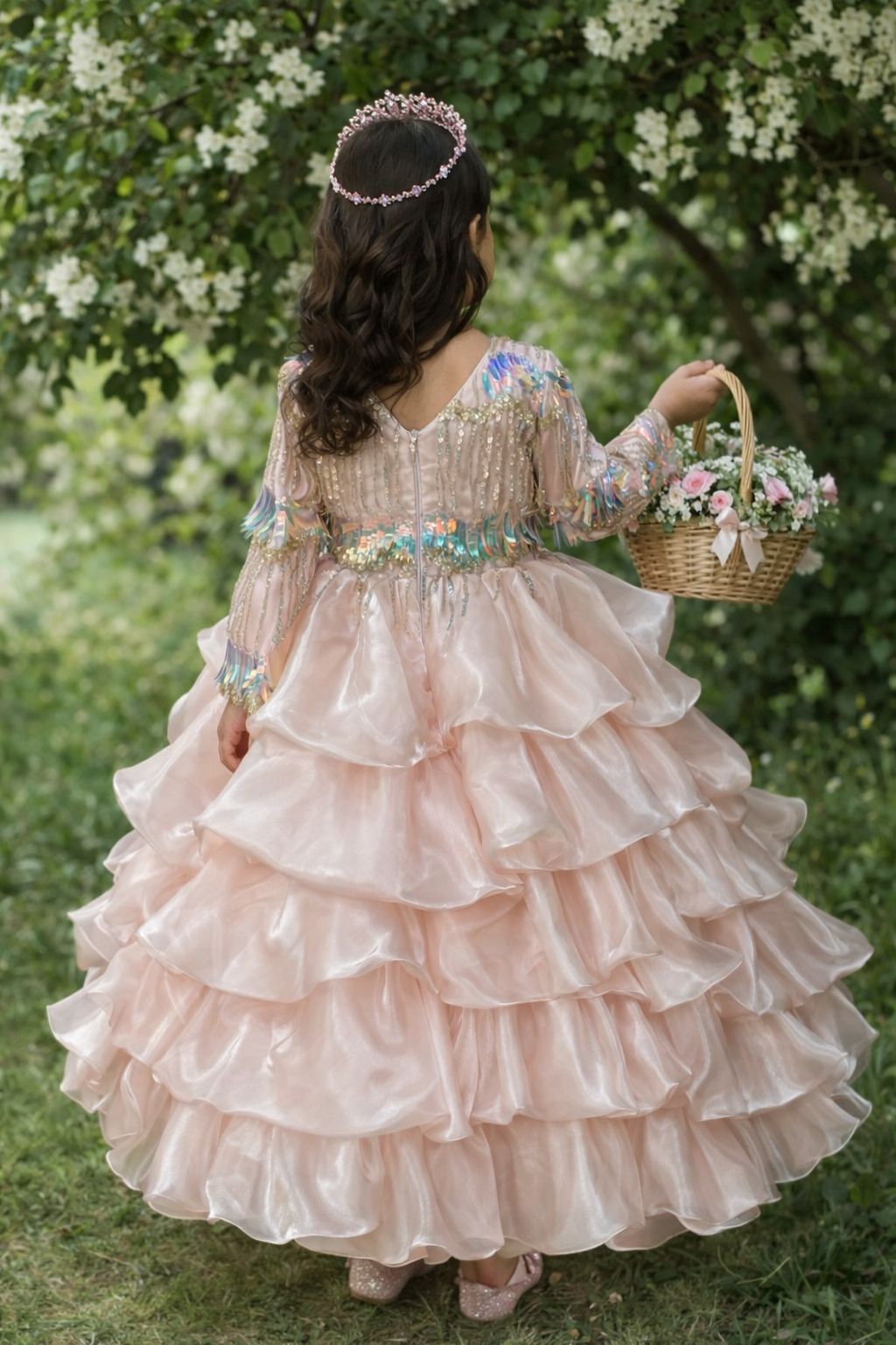 A peach dream made for little royalty. This flared peach dress with delicate sequin handwork is lovingly handcrafted to make her feel like a little princess. Soft hues, graceful flare, and fine details—created for special moments and even more special people.