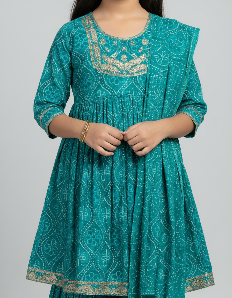 A beautiful green cotton suit crafted with delicate detailing, perfect for festive days and joyful celebrations. Elegant, timeless, and made to shine with every twirl. Let your little one glow in ethnic charm.
